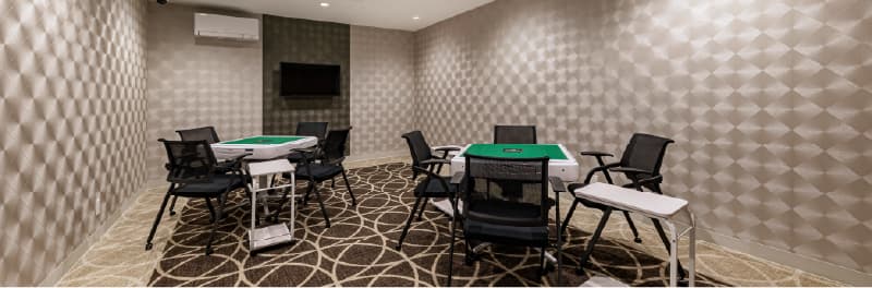 「プレイルーム」も多世代の社交場に。雀卓セットの他、囲碁、将棋、オセロ、トランプなど誰もが楽しめる備品、用具等が利用可能で、様々な世代とゲームに興じることも。また、サークル活動の場としてもご利用いただけます。