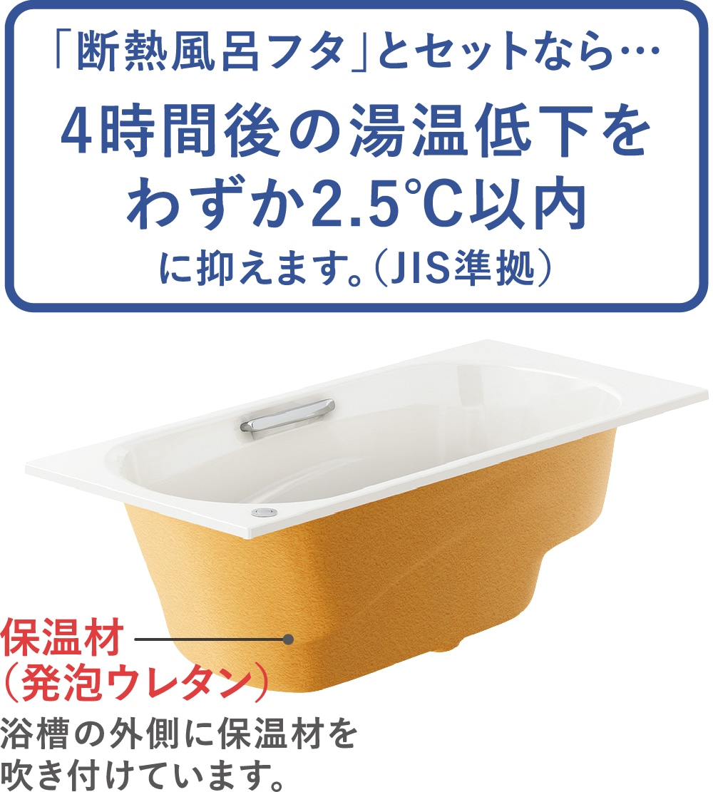 保温材の厚みを増やして断熱効果をアップ。お湯が冷めにくいので、次に入る人も快適です。