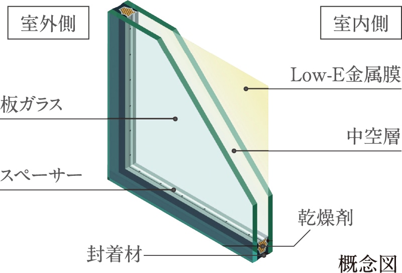 室内側ガラスの内面側に特殊金属膜を設けたLow-E複層ガラスを採用。遮熱性・断熱性が高く、夏の陽射しや寒い冬にも快適な室内環境を保つことができます。