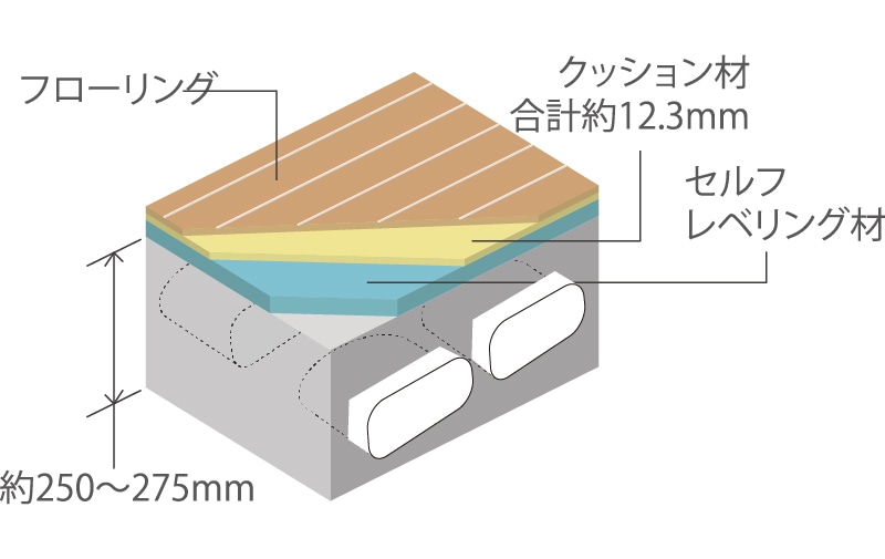 床スラブ躯体として剛性を高めるため、ボイドスラブで厚さ約250〜275㎜を確保。その上で遮音性に配慮したLL-45(ΔLL(Ⅰ)-4)等級のフローリングを採用しています。(一部除く)