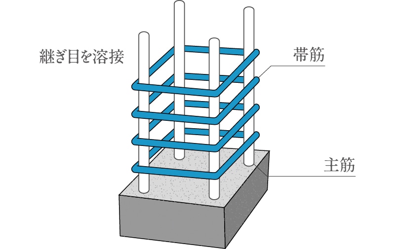建物を支える柱には、帯筋の継ぎ目を溶接した溶接閉鎖型帯筋を採用(外周部のみ)。通常の帯筋に比べて横揺れなどに対する強度を増しています。