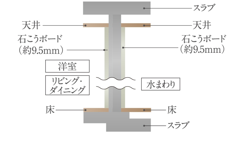トイレ、浴室、洗面室に接する洋室、リビング・ダイニング・キッチンの壁面には、石こうボードを施工した遮音壁を採用しています。