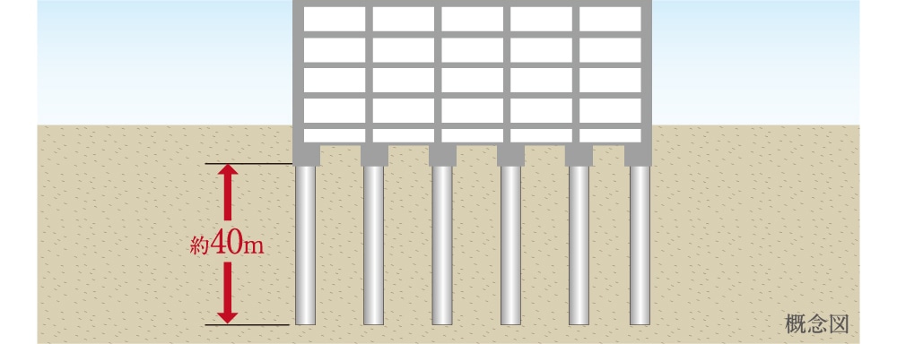 杭の先端を地中深くの支持基盤となる地層まで届かせて、支持杭を地盤から約41m〜約43m(杭長約40m)打ち込むことで、耐震性が向上した安定した基礎構造を可能にしています。